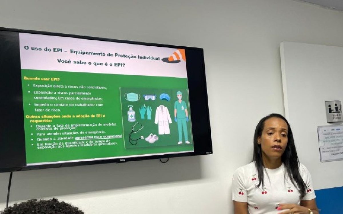 Durante a ação, colaboradores da unidade participaram de uma atividade conduzida pela enfermeira e farmacêutica Vanessa Nascimento, que destacou boas práticas de biossegurança e orientou sobre a utilização correta dos EPIs, fundamentais para a prevenção de acidentes e proteção dos trabalhadores da saúde.