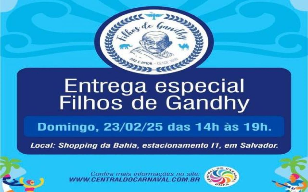 Ajayô! A Central do Carnaval antecipará a entrega das fantasias do tradicional Afoxé Filhos de Gandhy para o Carnaval 2025. A retirada começará neste domingo, 23 de fevereiro, das 14h às 19h, no estacionamento L1 do Shopping da Bahia.