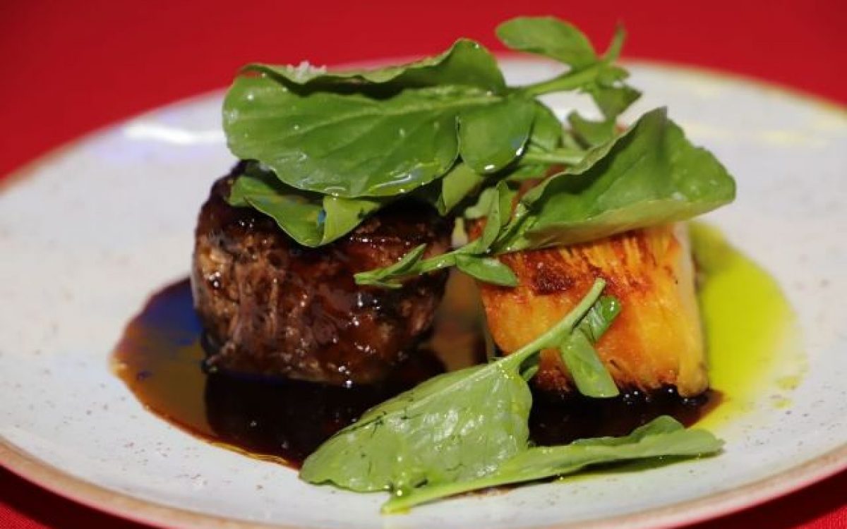 Restaurante Cia do Sertão (localizado em Salvador) Filet Oyster Stout com Mil Folhas de Aipim com molho a base de ostra, manteiga e cerveja RIS Caramelo Salgado