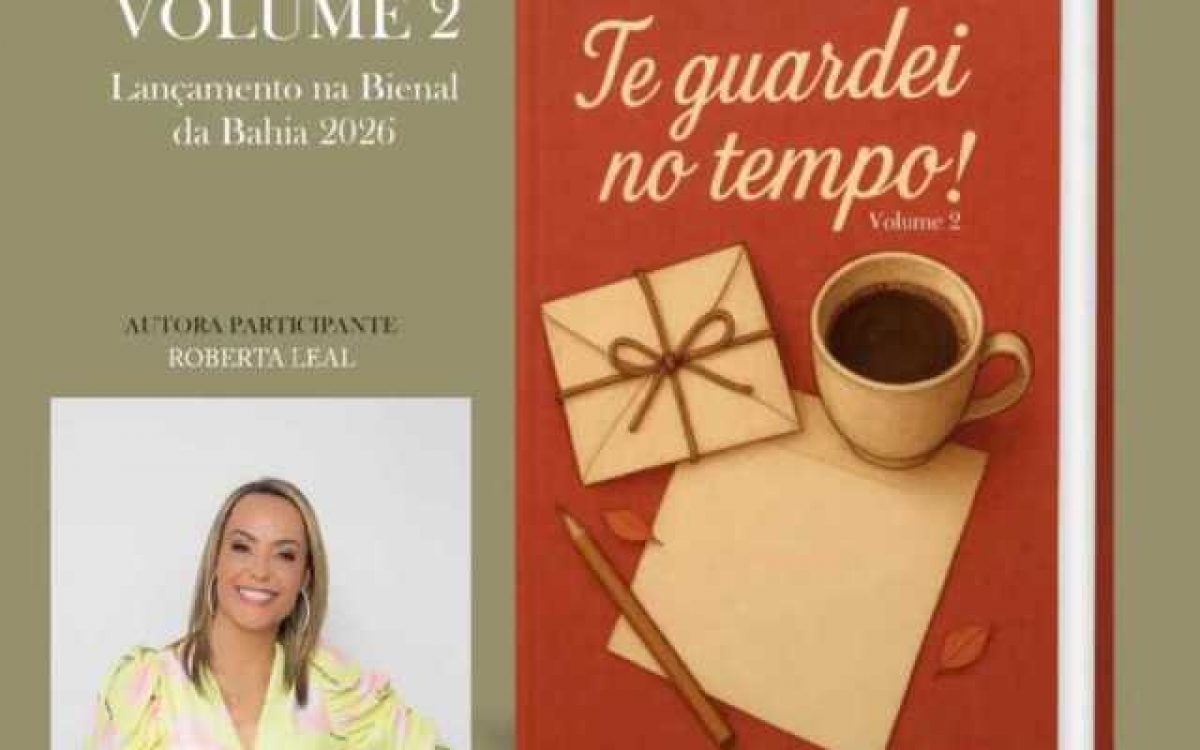 Além de cantora e compositora, a baiana Roberta Leal também tem mais um talento! Escritora e amante da língua portuguesa, Roberta participa pela primeira vez da Bienal do Livro Bahia neste ano de 2026 e já chega com a publicação de um texto no livro “Te Guardei no Tempo”. A obra que reúne uma coletânea com outros escritos de vários autores, será lançada no dia 18 de abril (sábado) às 12h, no Espaço Leia Mais. “Estou muito feliz em fazer parte deste projeto, em ter sido selecionada com meu texto para a segunda edição do livro e principalmente participar da Bienal do Livro Bahia como escritora. É uma grande honra. Estou muito lisonjeada. Muitos me conhecem como cantora, mas também uso a escrita como mais uma maneira de me posicionar no mundo”, comenta Roberta. Além da Bienal, o livro pode ser encontrado para compra através do site da Amazon.