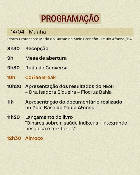 A abertura do evento acontece no dia 14 de abril, às 8h30 no Teatro Professora Maria do Carmo de Melo Brandão, em Paulo Afonso (BA). O encontro reunirá lideranças indígenas dos territórios de Paulo Afonso, Glória e Rodelas, além profissionais da saúde indígena, representantes do Distrito Sanitário Especial Indígena da Bahia (DSEI/BA) e do Conselho Distrital de Saúde Indígena (CONDISI). A programação também contará com atividades formativas voltadas aos profissionais de saúde.