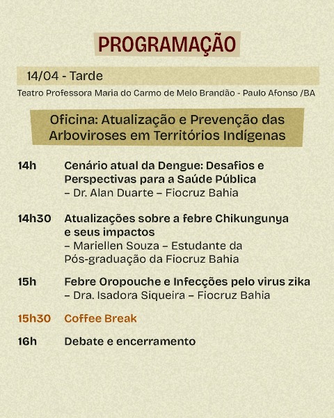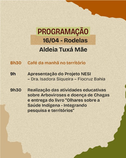 Glória, com atividades voltadas à divulgação científica e à educação em saúde, abordando temas como arboviroses e doença de Chagas. No dia 16 de abril, as ações seguem para a Aldeia Tuxá Mãe, em Rodelas, fortalecendo o diálogo com as comunidades por meio de atividades educativas e de promoção da saúde. Encerrando a programação, no dia 23 de abril, no Auditório Sonia Andrade, na Fiocruz Bahia, em Salvador, será realizado o lançamento do livro, além da apresentação das atividades de divulgação científica desenvolvidas nos territórios.
