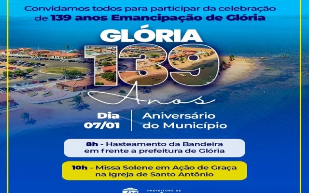 O município de Glória completa, no próximo 07 de janeiro, 139 anos de Emancipação Política. Para marcar a data, a Prefeitura preparou uma programação oficial com atividades cívicas, religiosas e esportivas, voltadas à população.