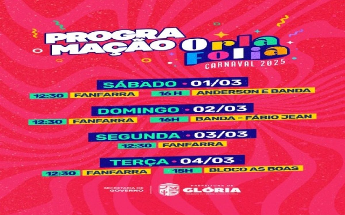 O Carnaval está chegando, e em Glória a folia promete ser inesquecível! O Orla Folia 2025 vem aí para transformar o Balneário Canto das Águas no maior point carnavalesco da região, com muita música, animação e aquele clima contagiante às margens do Velho Chico.