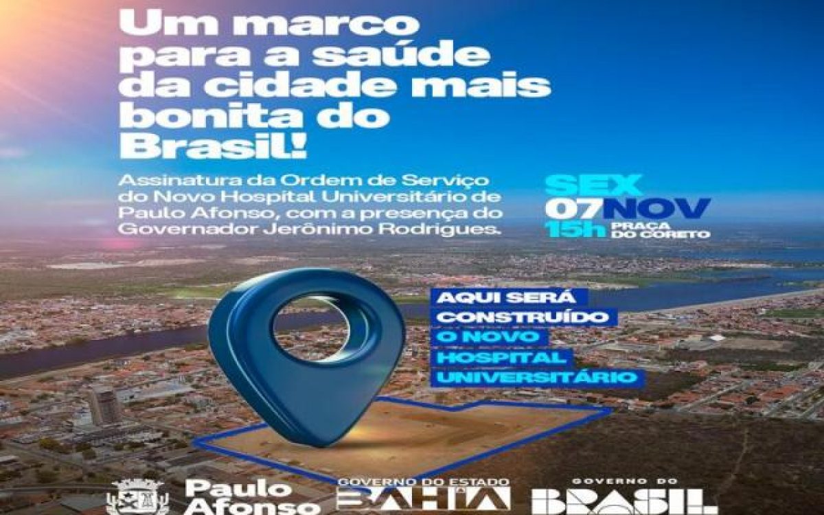 A Prefeitura de Paulo Afonso realiza, nesta sexta-feira, 07 de novembro, às 15h, a cerimônia de assinatura da ordem de serviço para a construção do novo Hospital Universitário de Paulo Afonso. O evento, que contará com a presença do Governador Jerônimo Rodrigues, acontecerá na Praça do Coreto.