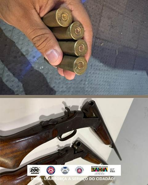 Durante buscas realizadas na localidade, o suspeito não foi localizado, mas duas espingardas cal.26 e quatro munições do mesmo calibre foram encontradas em um imóvel velho e abandonado. O proprietário do imóvel não foi identificado.