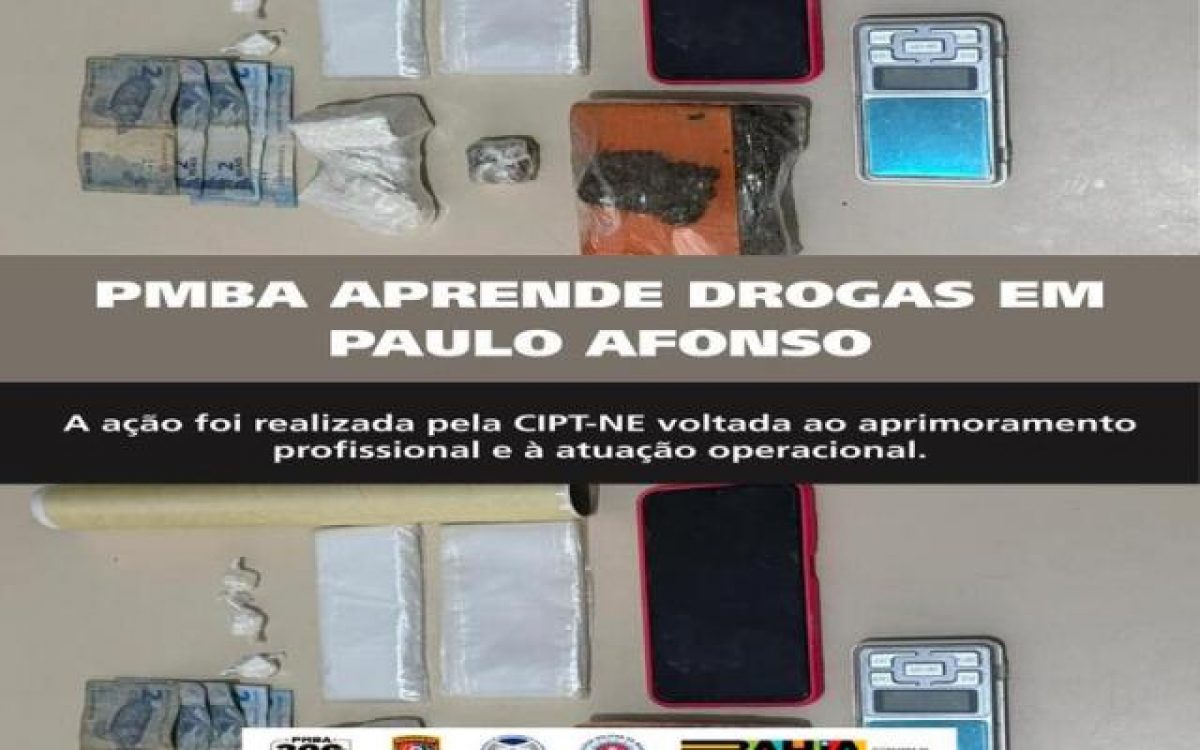 Guarnições da CIPT-NE, durante patrulhamento tático, averiguaram denúncia de tráfico de drogas. No local, após a moradora franquear o acesso e autorizar a busca domiciliar, foi encontrada uma mochila contendo quantidade expressiva de substâncias análogas à maconha e cocaína, além de balança de precisão. Diante da materialidade, a responsável e o material ilícito foram apresentados à autoridade competente.