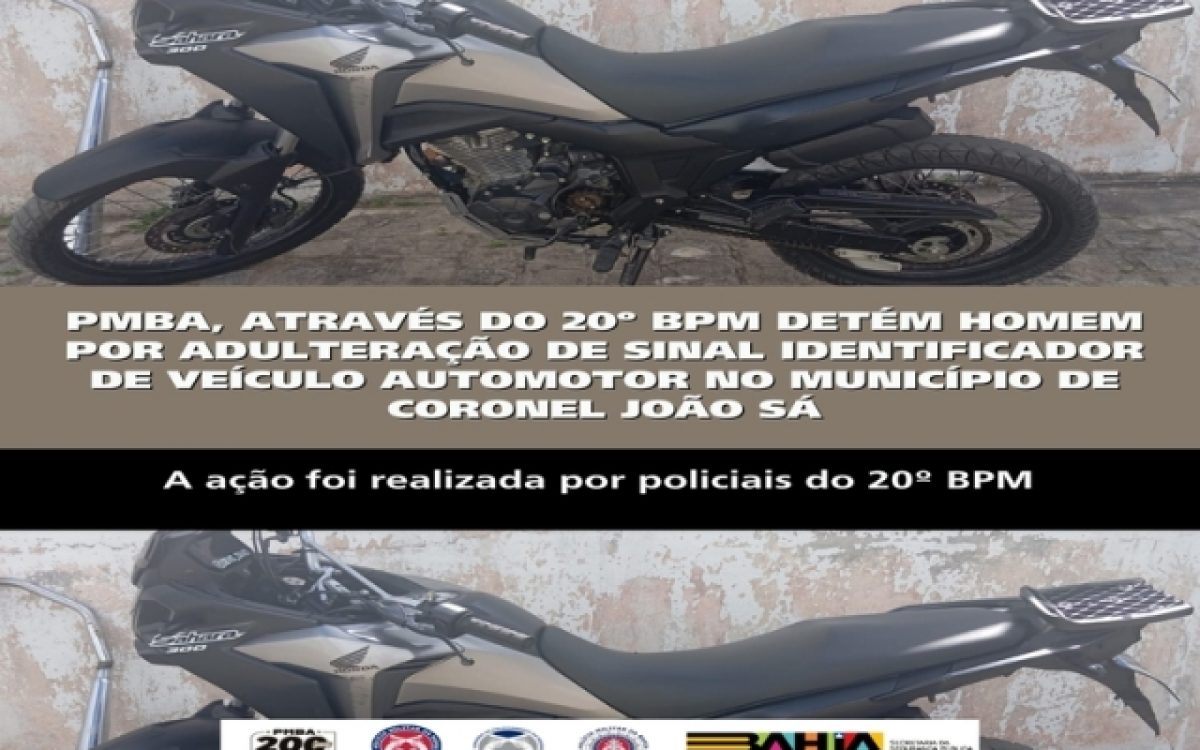 Na quinta-feira, 07 de agosto, policiais militares do 20º Batalhão de Polícia Militar (20º BPM) realizavam rondas ostensivas no município de Coronel João Sá, quando visualizaram um indivíduo trafegando sem placa e em alta velocidade pela Avenida Doutor Carvalho Sá, conduzindo uma motocicleta.