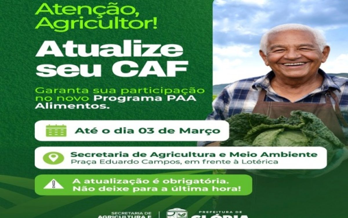 A Prefeitura Municipal de Glória, por meio das Secretarias de Agricultura e Meio Ambiente e de Assistência Social, convoca todos os produtores rurais do município para a atualização do Cadastro da Agricultura Familiar (CAF). O procedimento é indispensável para garantir a participação no novo Programa de Aquisição de Alimentos (PAA), política pública que fortalece a produção local e garante renda direta para o homem e a mulher do campo.