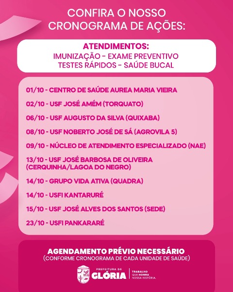 Em Glória, a programação inclui imunização, exame preventivo, testes rápidos e saúde bucal, organizados em cronograma específico para cada unidade de saúde. Para participar, é necessário realizar agendamento prévio.