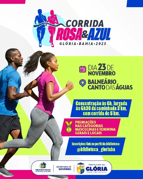 A Prefeitura Municipal de Glória, por meio da Secretaria Municipal de Governo e da Biblioteca Pública Municipal, realizará a Corrida Rosa & Azul 2025, um evento que une esporte, saúde e conscientização em uma manhã especial no Balneário Canto das Águas.