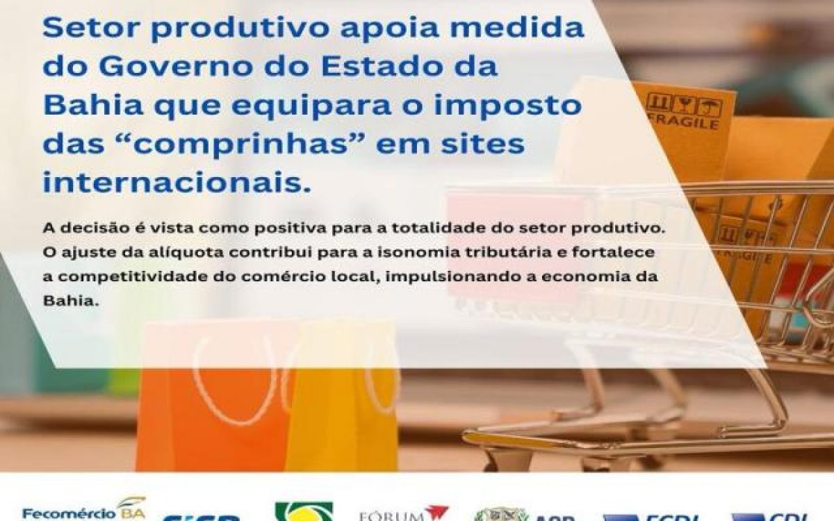 Entidades representativas do setor produtivo baiano, a Fecomércio BA, a FIEB, a FACEB, o Fórum Empresarial da Bahia, a Associação Comercial da Bahia, a FCDL Bahia e a CDL Salvador, divulgam posição conjunta manifestando seu total apoio à decisão do Governo do Estado em equiparar a alíquota do ICMS de 17% para 20%, das chamadas “comprinhas”, termo usado para compras internacionais feitas via plataformas digitais.