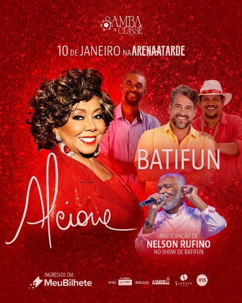 Salvador, prepare-se para o Samba de Classe! No dia 10 de janeiro (sábado), a Arena A TARDE recebe a primeira edição do evento, que celebra a tradição, a sofisticação e a força do samba brasileiro. A abertura da noite ficará por conta da banda Batifun, com participação especial de Nelson Rufino. Em seguida, acontece a apresentação da grande atração, Alcione, que escolhe a capital baiana para dar início à sua turnê 2026. Os ingressos estão à venda on-line pelo Meu Bilhete e presencialmente no Balcão Ingressos Bahia, no Shopping Barra, sem adição de taxa de serviço.