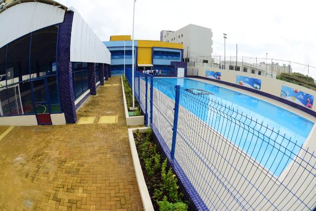 Homenagem – A Escola Municipal Valdemar Bibiano Jorge Amado tem auditório, sala de leitura, sala de dança e música, piscina, parque infantil, salas de recursos multifuncionais, quadra poliesportiva,sanitários PCD, sistema de captação de energia solar e reutilização de água pluvial.