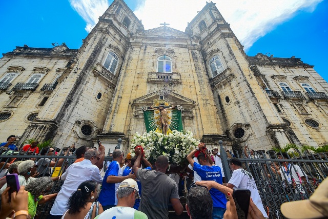 Uma procissão marítima fez o traslado, na manhã deste domingo (11), da imagem de Nosso Senhor do Bonfim até a Basílica de Nossa Senhora da Conceição da Praia, no Comércio. O cortejo pelo mar, organizado pelo Santuário Senhor do Bonfim, precede a Lavagem do Bonfim, que acontece na próxima quinta-feira (15), com caminhada a pé levando a imagem de volta à Colina Sagrada, no Bonfim.