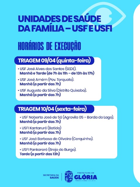 Já no dia 10 de abril (sexta-feira), a triagem será realizada nas unidades Noberto José de Sá (Agrovila 05 – Borda do Lago), Kanturaré (Batida) e José Barbosa de Oliveira (Cerquinha), no turno da manhã, além da USFI Pankararé (Brejo do Burgo), no período da tarde.