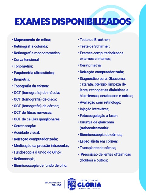 A Prefeitura de Glória, por meio da Secretaria Municipal de Saúde, promoverá um Mutirão Oftalmológico com o objetivo de ampliar o acesso da população aos cuidados com a saúde ocular. A ação contempla triagem, exames especializados e encaminhamentos, contribuindo diretamente para a prevenção, diagnóstico e tratamento de doenças da visão.